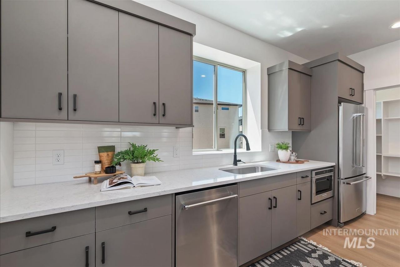 Welcome to this stylish, move-in-ready townhome offering a smart and versatile layout in a convenient Boise location with quick access to the airport, freeway, Downtown Boise, and Boise State University. One of the standout features of this home is the opportunity to enjoy beautiful views of the Boise Foothills bringing a scenic backdrop to everyday living. The entry level features a private bedroom with a full bath, ideal for guests, a home office, or flexible living needs. The main living area showcases an open-concept design with durable luxury vinyl plank flooring, creating seamless flow for everyday living and entertaining. The modern kitchen features designer soft-close cabinetry with ample storage and a sleek, contemporary aesthetic, while the spacious Great Room provides a comfortable gathering space. Step outside to the covered patio, perfect for relaxing, enjoying fresh air, or taking in the surrounding foothill views. The third floor offers two private bedroom suites, including the Primary Suite with dual vanities, quartz countertops, and elegant tile finishes. A secondary bedroom with its own ensuite bath provides ideal separation for guests or roommates. Washer, dryer, and blinds included for added convenience.