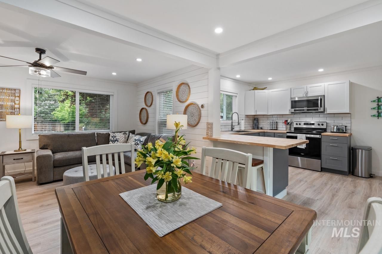 Tucked away in Boises highly sought-after North End, this beautifully remodeled 2-bedroom, 1-bath home offers the perfect blend of charm, modern updates, and outdoor space. Situated on nearly 1/3 of an acre, the wooded lot provides a rare sense of privacy and tranquility, all while being just minutes from the best the city has to offer. Inside, youll find a thoughtfully updated interior featuring warm butcher block countertops, new windows and doors, and fully upgraded plumbing and electrical gives you peace of mind and move-in ready convenience. The homes fresh siding enhances curb appeal, while natural light fills the inviting living spaces. Outside, the property truly shines. Enjoy a fully fenced yard with ample room for gardening, entertaining, or simply relaxing under the covered patio. Theres even dedicated RV parking and an attached garage complete with a workshop, perfect for hobbies, storage, or projects. Located with easy access to Hyde Park shopping/restaraunts, downtown Boise, scenic parks, the Boise River, and Bogus Basin, this home offers both lifestyle and location. Whether youre seeking outdoor adventure or vibrant city living, this North End gem delivers it all.
