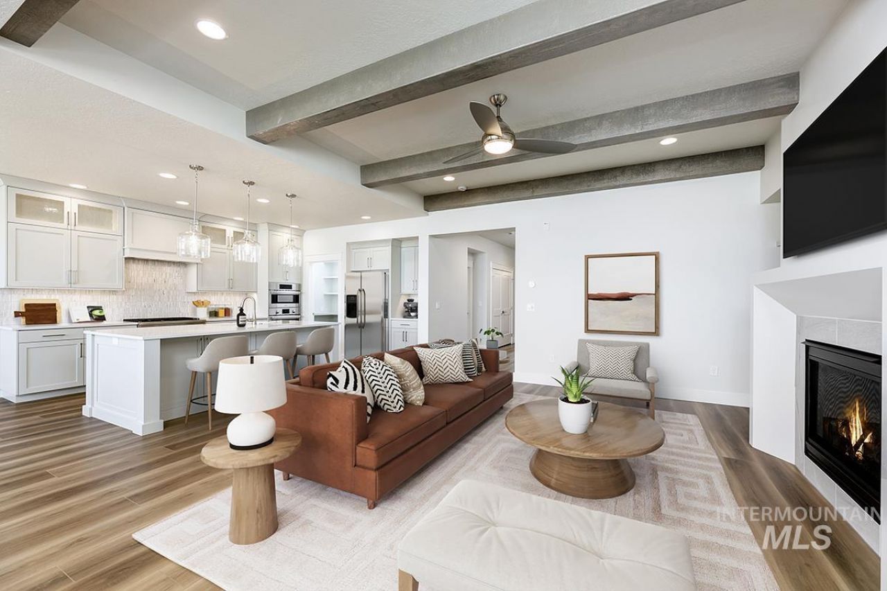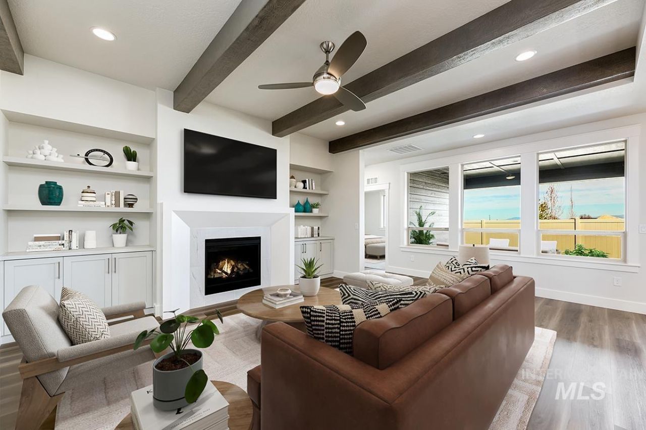 The CHANDLER MODEL| Blackrock Homes. Corner homesite w/ NO backyard neighbors w/views of Boise Front. Enjoy COMMUNITY POOL, pickle ball courts, playground + community dog parks! Upgraded finishes include custom cabinets, all quartz countertops, hardwood (lvp), upgraded trim detail including stained beams in living room & built-in cabinets flanking gas fireplace, SS appliances including built-in 5 burner industrial gas range, built in Bosch oven, microwave & dishwasher. Walk-in butlers pantry + tons of additional storage throughout. Light & airy floor plan w/lots of natural light. Tile floors in laundry, secondary & primary baths. INCLUDES FULL VINYL FENCING & FRONT & REAR YARD SPRINKLERS & LANDSCAPING. Easy access to the interstate, Downtown Meridian, shopping, dining, & entertainment. BTVA